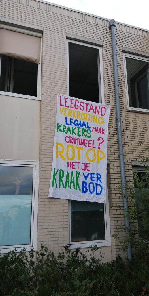 it looks like someone is more interested in a cool picture with a radical banner than a real occupation of an empty building. clean it is obvious that there is no policeman in Utrecht who will allow you to stay seeing such a banner