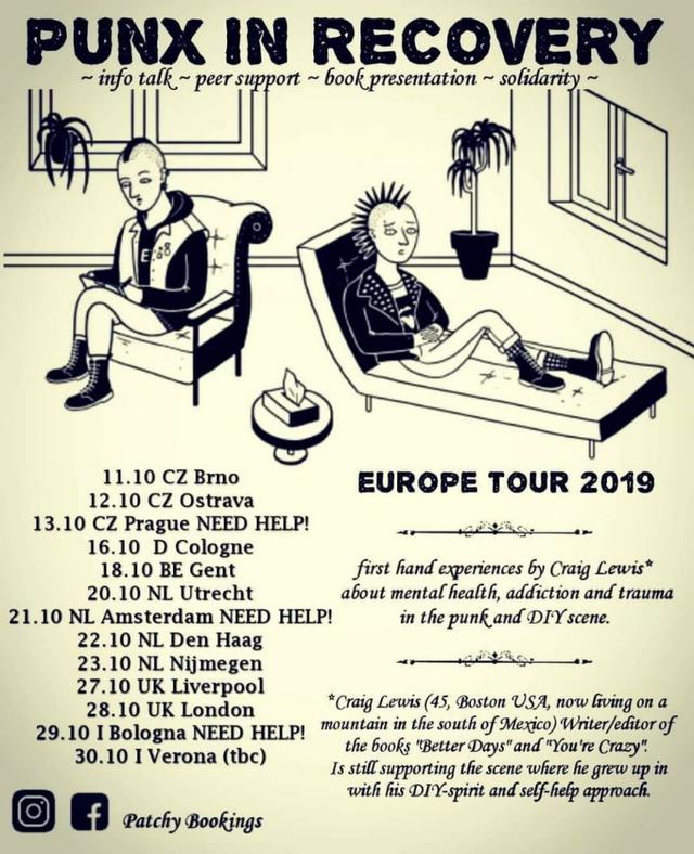 Lewis is touring Europe with his latest book, Punx in Recovery, sharing his personal experiences with mental health struggles in the diy / punk scene in US. Based on his own experience, Lewis discusses ways to deal with these issues in our communities.