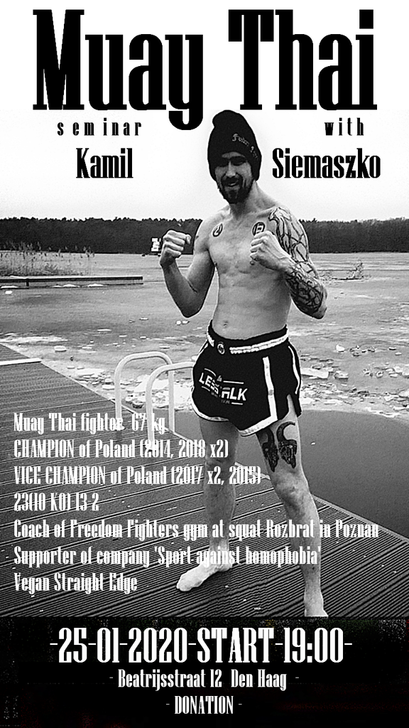 Muay Thai seminar with Kamil Siemaszko multiple champion and vice champion of Poland, activist, antifascist, vegan Straight Edge, coach of Freedom Fighters gym at squat Rozbrat in Poznan (Poland) Supporter of company 'Sport against homophobia'