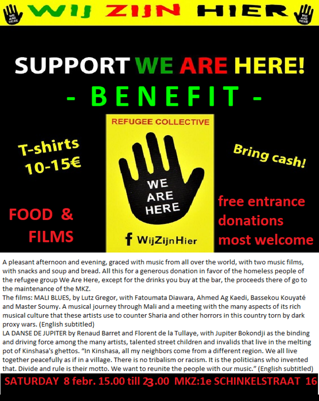 A pleasant afternoon and evening, graced with music from all over the world, with two music films, with snacks and soup and bread. All this for a generous donation in favor of the homeless people of the refugee group We Are Here, except for the drinks you buy at the bar, the proceeds there of go to the maintenance of the MKZ.