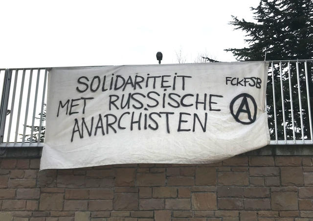 Zaterdag zeven maart hebben we twee spandoeken opgehangen in Den Haag in solidariteit met de anarchisten en antifascisten die worden vervolgd en gemarteld in Rusland.