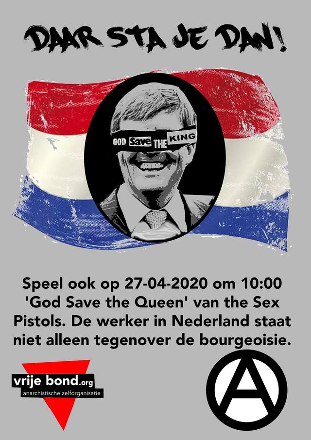In reactie op de oproep van het Concertgebouw om het Wilhelmus mee te zingen op koningsdag, roept de Vrije Bond iedereen in Nederland op om zo hard mogelijk het anti-monarchistische nummer 'God Save the Queen' van de Sex Pistols te spelen op hun geluidsapparatuur. De anarchistische vakbond doet deze oproep als statement tegen het koningshuis. Een man die 5,9 miljoen per jaar verdient behoort niet gevierd, maar gelyncht te worden als het volk lijdt.