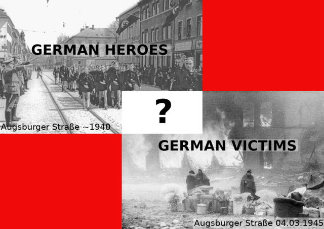The clip is the reaction on the exhibition "ENDING // BEGINNING: Neu-Ulm 1945" made by the Neu-Ulm archive in the public library. Instead of celebrating 75 years of liberation and reflecting on the cruelties it shows 75 years of bombing, presenting the Germans as harmless victims and in the folowing as great heroes of rebuilding their country.