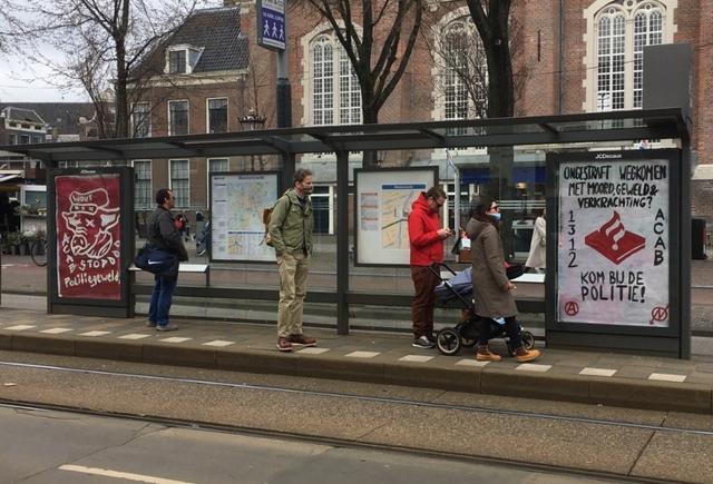 First picture: Banner hanging from a house, in black and red it says: From Amsterdam to London to Greece, Everybody hates police Second picture: A poster in a tram stop that says in Dutch (translated): Want to get away with murder, violence & rape? (Police logo in red) Join the police! Third picture: A poster in a tram stop that says: We don't forgive, we don't forget, justice for Mitch Henriquez, Tomy Holten, Sammy Seewald and all victims of police violence