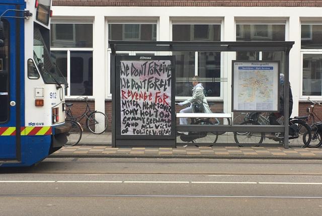 Derde foto: Een poster hangt in een tramhalte, waarop staat: We don't forgive, we don't forget, justice for Mitch Henriquez, Tomy Holten, Sammy Seewald and all victims of police violence (English) Description of the pictures with the text: