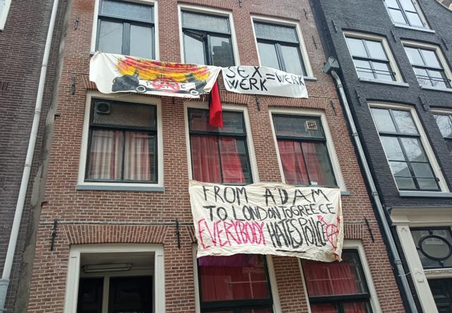 Eerste foto: Een spandoek hangt van een huis, waarop staat in rood en zwart: From Amsterdam to London to Greece, Everybody hates police