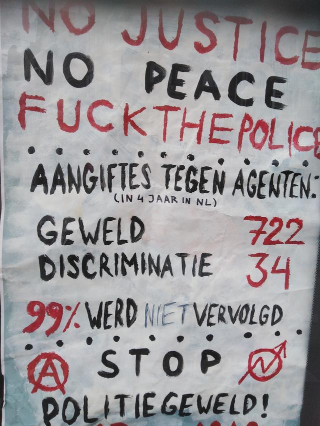 Poster met in rode en zwarte letters: No justice, no peace, fuck the police. Aangiftes tegen agenten (in 4 jaar in NL): geweld 722, discriminatie 34, 99% werd niet vervolgd. Stop politiegeweld! (Anarchistisch symbool aan de zijkant) in English, Description of the picture: poster with red and black letters saying: No justice, no peace, fuck the police. Amount of reports against cops (in 4 years time in the netherlands): violence 722, discrimination 34, 99% was not prosecuted. Stop police brutality! (Anarchist symbol on the side)