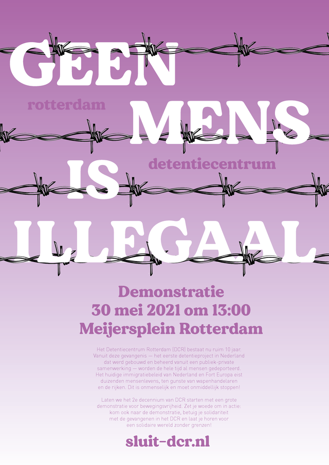Het Detentiecentrum Rotterdam (DCR) bestaat nu ruim 10 jaar. Vanuit deze gevangenis — het eerste detentieproject in Nederland dat werd gebouwd en beheerd vanuit een publiek-private samenwerking — worden de hele tijd al mensen gedeporteerd. Het huidige immigratiebeleid van Nederland en Fort Europa eist duizenden mensenlevens, ten gunste van wapenhandelaren en de rijken. Dit is onmenselijk en moet onmiddellijk stoppen!