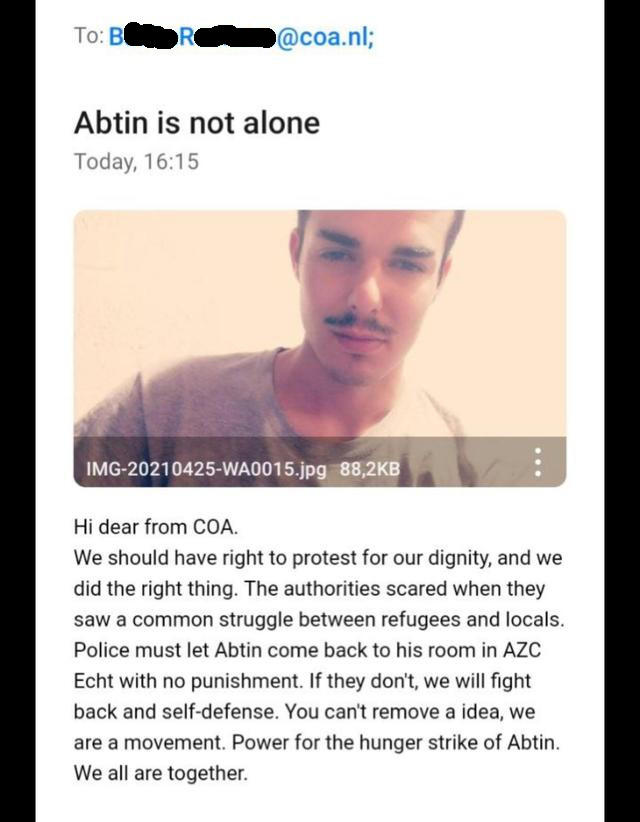 We should have right to protest for our dignity, and we did the right thing. The authorities scared when they saw a common struggle between refugees and locals. Police must let Abtin come back to his room in AZC Echt with no punishment. If they don't, we will fight back and self-defense. You can't remove a idea, we are a movement.