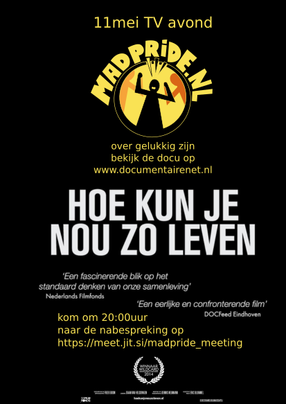 Wij passen ook niet in de succes georiënteerde maatschappij, hoe voel jij je daarover? Bekijk de film van te voren op https://documentairenet.nl/hoe-kun-je-nou-zo-leven/ (deze duurt 50 minuten) en kom om 20.00 uur in het Jitsi kanaal https://meet.jit.si/madpride_meeting om mee te praten over deze video.