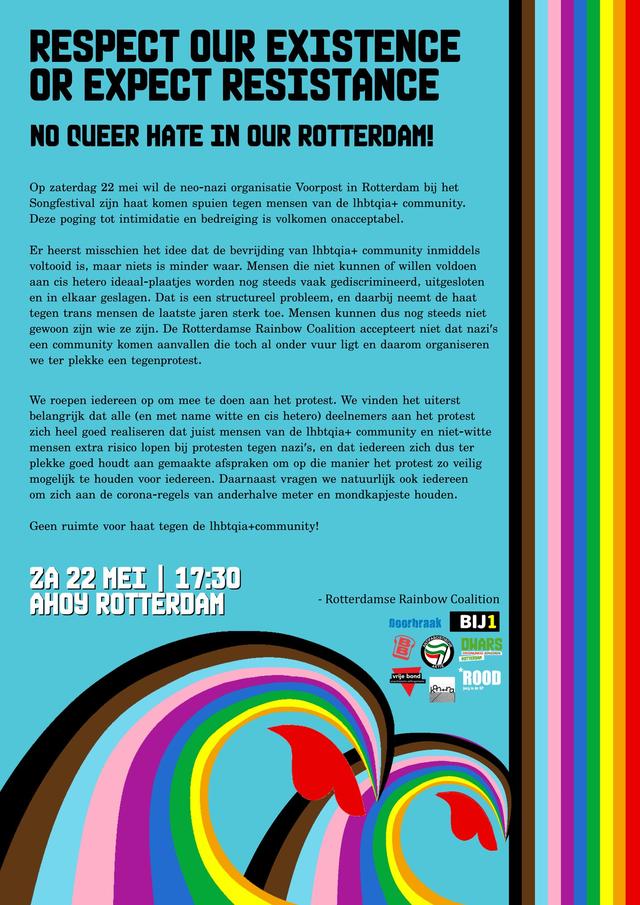 Op zaterdag 22 mei wil de neo-nazi organisatie Voorpost in Rotterdam bij het Songfestival zijn haat komen spuien tegen mensen van de lhbtqia+ community. Deze poging tot intimidatie en bedreiging is volkomen onacceptabel.
