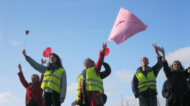 We vertrekken om 16.00 uur vanaf Beursplein richting het vliegveld. We dragen harten met ons mee in de vorm van ballonnen, op vlaggen of kleding et.We strooien broodkruimels als in het bekende sprookje.Om 18.00 uur komen we aan en dan houden we een lawaai en zwaai-actie aan de achterkant van het centrum. Om 19.00 uur is er de mogelijkheid aan te sluiten bij de wake , aan de voorkant van het centrum, zoals dat daar al ruim zeven jaar maandelijks plaatsvindt. Er wordt gezongen er er wordt verslag uitgebracht door de bezoekgroep.