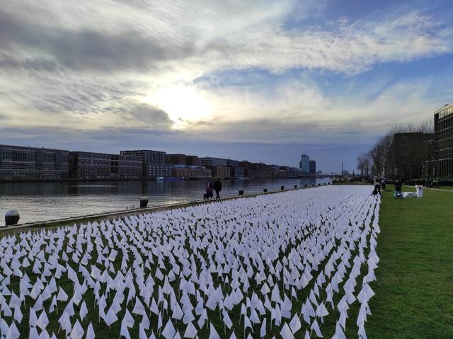 35.000 witte vlaggetjes voor allen die tot nu toe in Nederland overleden zijn aan corona. Nu in de Bogortuin (halte Azartplein) in Amsterdam tot zondag 20 maart 2022. Georganiseerd door burgerinitiatieven Containment Nu / St. Protect Everybody / Alle Handen Samen en anderen.