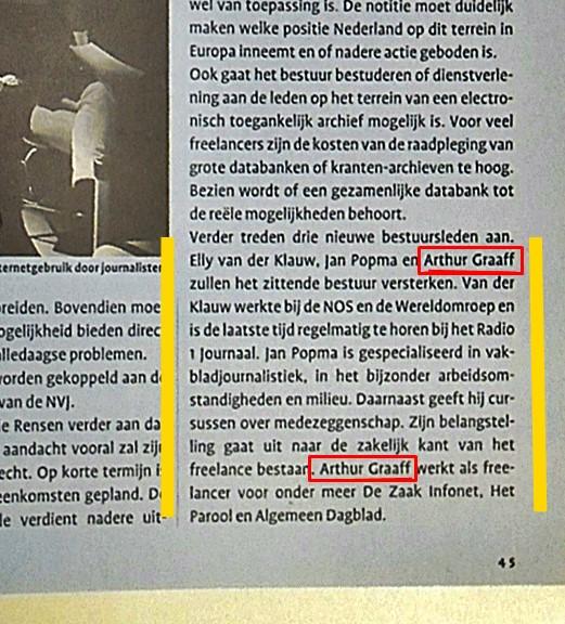 Recent heeft Droog gepubliceerd dat Graaff géén bestuurslid zou zijn geweest van de NVJ. Echter: op 21 maart 1997 meldt het vakblad van de Ned. Ver. van Journalisten, 'De Journalist' op pag. 47 dat Graaff is aangesteld.