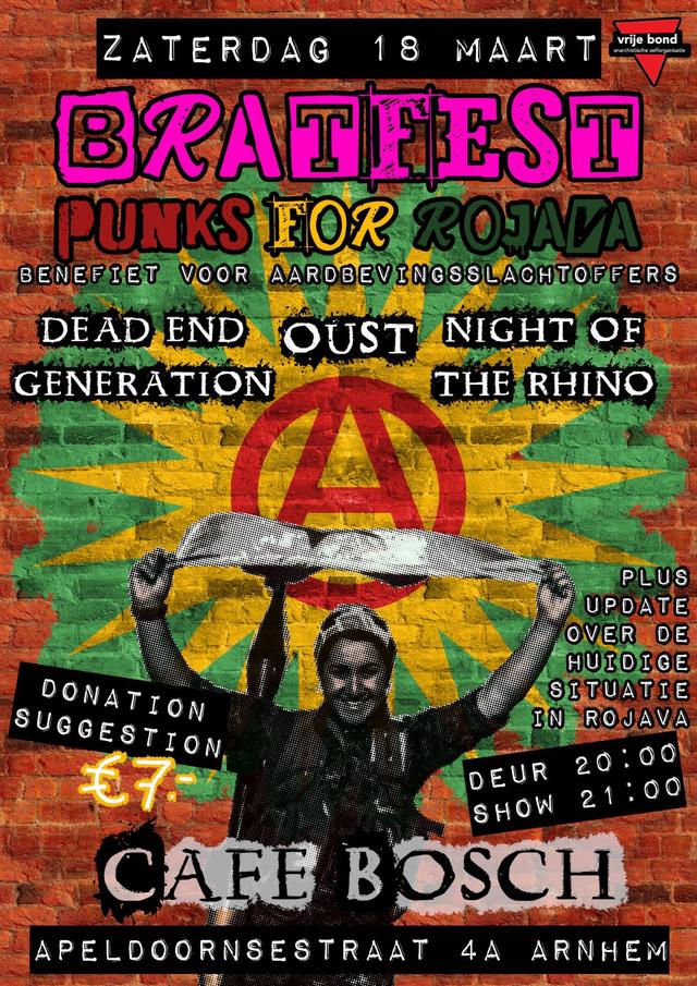 Zaterdag 18 maart organiseert de Vrije Bond in samenwerking met Café Bosch: BRADFEST, Punks for Rojava, een benefiet voor de aardbevingsslachtoffers in Rojava.
