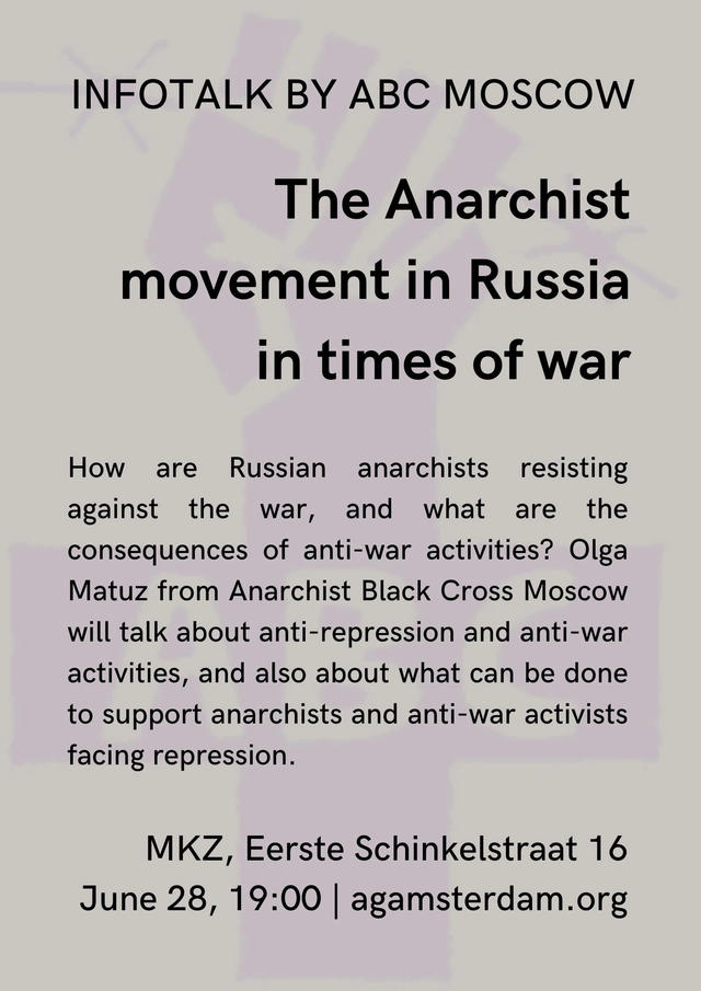 How are Russian anarchists resisting against the war, and what are the consequences of anti-war activities? Olga Matuz from Anarchist Black Cross Moscow will talk about anti-repression and anti-war activities, and also about what can be done to support anarchists and anti-war activists facing repression.