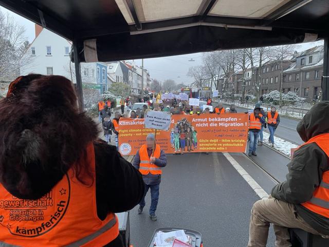 Op 2 december gingen, ondanks de ijzige kou, ongeveer 200 mensen de straat op in Gröpelingen onder het motto "Bestrijd de klimaatcrisis, oorlogen en armoede - niet migratie". De sfeer was erg goed. Er werden veel leuzen geroepen, zoals "People Power Solidariteit", "Vluchtelingen blijven - machthebbers verdrijven" of "Samen van onderop tegen het fascisme". De sambagroep Rythm of Resistance zorgde ook voor een goede sfeer. Aan het begin maakte de moderator in het Duits, Turks, Arabisch en Engels duidelijk waar de demonstratie over ging. Er was ook een korte verklaring tegen de oorlog in verschillende talen. Je kunt alle teksten van de moderatie hieronder vinden. Na een toespraak van de antiracistische groep "Antira United" en het gezamenlijk zingen van Bella Ciao, gingen we eindelijk van start.