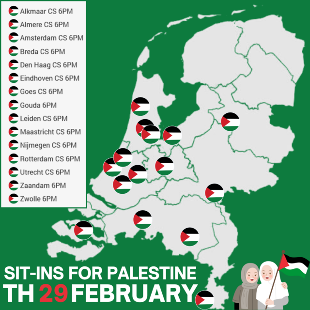 It’s essential that we find the strength to continue with actions for Palestine. Confirmed cities so far are: Alkmaar, Almere, Amsterdam, Breda, Den Haag, Eindhoven, Goes, Gouda, Leiden, Maastricht, Nijmegen, Rotterdam, Utrecht, Zaandam, Zwolle