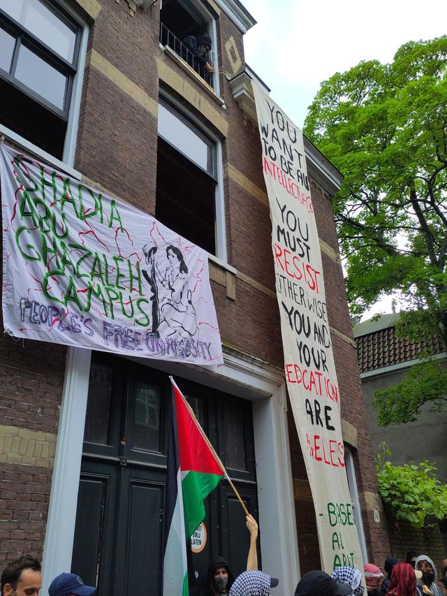 Vandaag, op 25 mei, begonnen pro-Palestijnse demonstranten met hun protest op het Spui om 14:00. Deze demonstratie bewoog zich door de straten van Amsterdam naar Achter Oosteinde 16, waar de demonstranten onthulden dat een gekraakt pand wordt opengesteld voor het publiek als de eerste campus van the People's Free University. De Shadia Abu Ghazaleh Campus zal een ruimte van verzet zijn waar men van elkaar kan leren en elkaar kan onderwijzen. De campus is vernoemd naar een van de eerste Palestijnse vrouwen die deelnam aan gewapend verzet in 1967: "Zij kende het belang van kennis en educatie in de strijd voor bevrijding. [...] Wij zullen deze ruimte in haar nalatenschap creëren," zeggen de demonstranten.