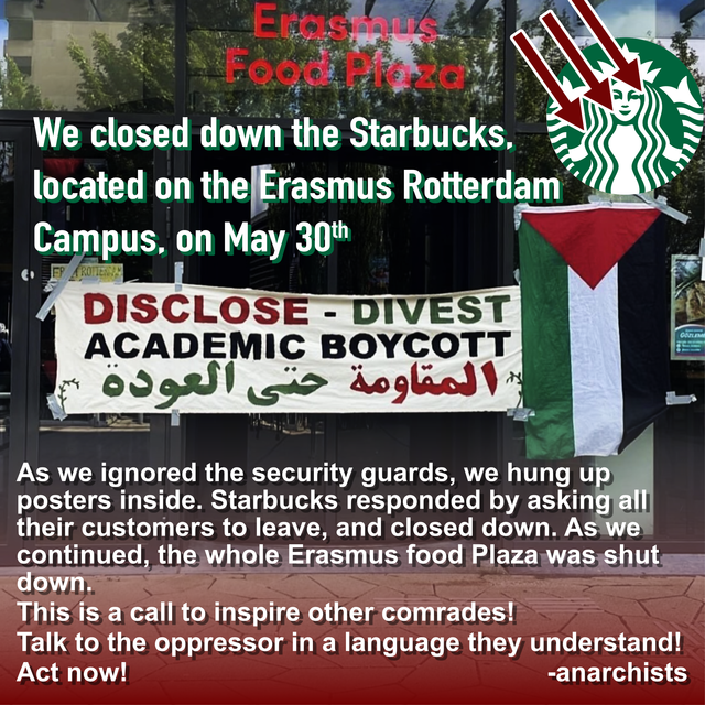 As we ignored the security guards, we hung up posters inside. Starbucks responded by asking all their customers to leave, and closed down. As we continued, the whole Erasmus food Plaza was shut down.