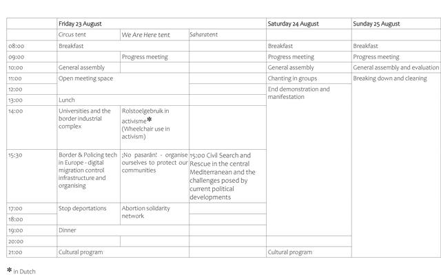 The No Border Camp is an ACTION camp, meaning that we also ask you to come well prepared to join actions (if you want). Next to the actions we have a workshop schedule (see below) and a cultural program in the evenings.