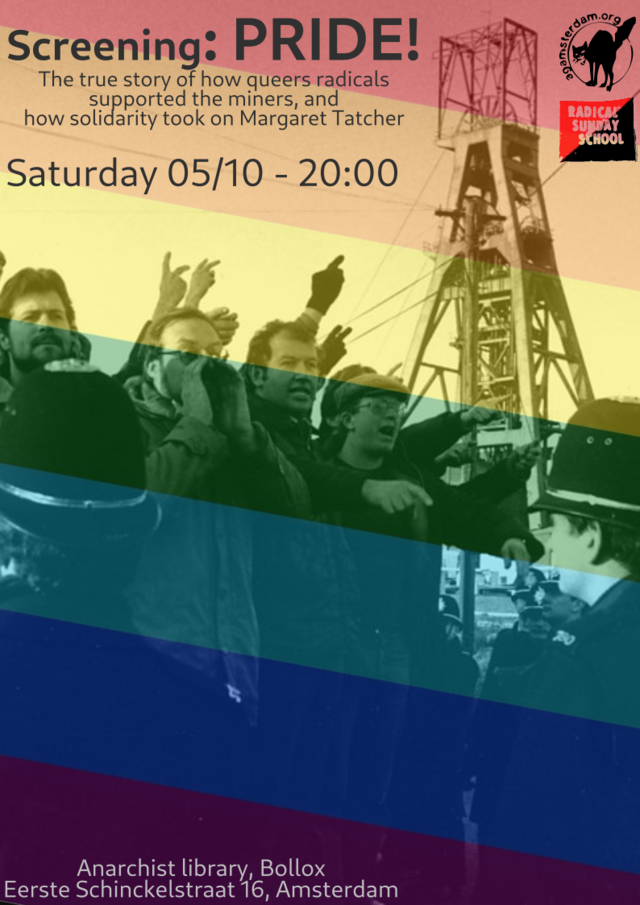 Join Radical Sunday School and the Anarchist Group Amsterdam for a screening of Pride!, 2014 movie based on the true story of LGSM and its work in radical solidarity!