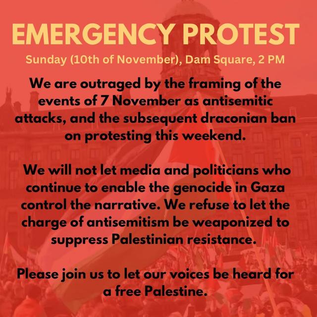 XR Justice Now, PalAction NL, Erev Rav, Artsen voor Gaza, Samidoun, Zaankanters voor Palestina, Week.4PalestineNL, Amsterdam4Palestine, MiGreat, Amsterdam Encampment, Utrecht4Palestine, UU Encampment/USP, Workers For Palestine, Nijmegen Student Encampment, Platform Stop Racisme and Fascisme, BIJ1 Arnhem-Nijmegen, Groningen Student Encampment, Alkmaar voor Palestina, VU for Palestine, Enschede Students for Palestine, Students for Palestine, Leiden for Palestine, Breda Solidair, Nijmegen for Palestine, Platform Stop Racisme and Fascisme, Arnhem-Nijmegen, Leerdam4Palestina, Zwolle4Palestine