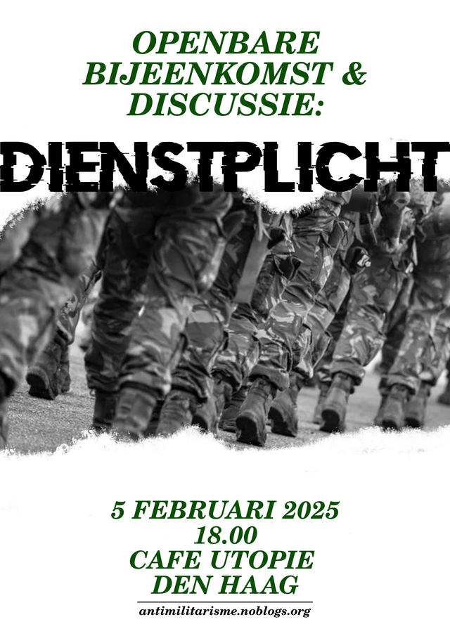 Als antimilitaristen verzetten wij ons tegen zulke maatregelen, maar waarom? Kom mee doen aan het gesprek over de dienstplicht om dat juist te bespreken. Neem je vragen en mededelingen mee, je twijfels en vastberadenheid, je perspectieven op de toekomst of juist je verhalen uit het verleden.