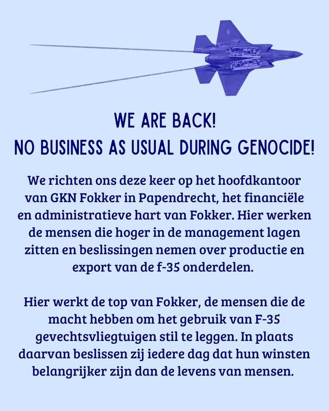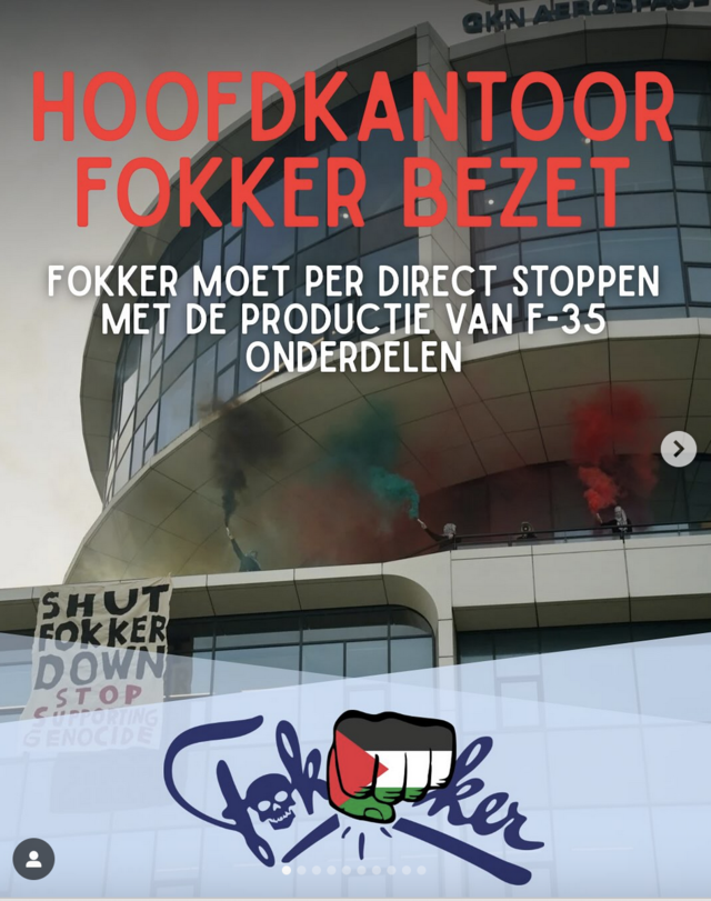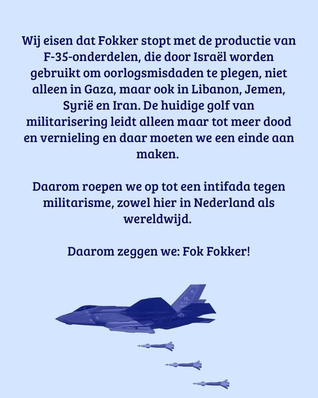 We demand that Fokker stop producing F-35 parts, which are being used by Israel to commit war crimes, not only in Gaza, but also in Lebanon, Yemen, Syria, and Iran. The current wave of militarization only leads to more death and destruction, and we must put an end to it.