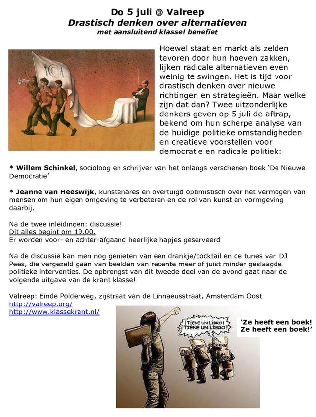 After the debate drinks and snacks will be served, DJ Pees will play music and images of the recently more or less successful interventions will be shown. This part of evening will help the quaterly newspaper Klasse! to publish its next issue.