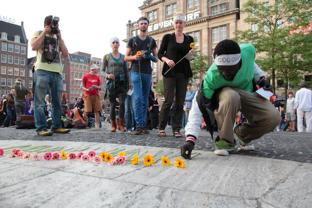 De demonstratie liep van het Amsterdam centraal station naar de dam. Hier werden bloemen neergelegd omdat een jaar geleden iemand zijn ellende niet langer trok en zichzelf in brand stak.
