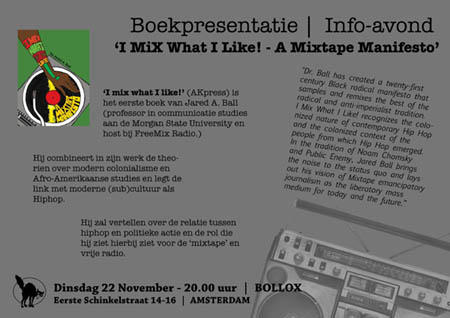 ‘I Mix What I Like!’ (AK Press) is het eerste boek van Jared A. Ball (professor in communicatie studies aan de Morgan State University en host bij FreeMix Radio) Hij combineert in zijn werk de theorieën over modern kolonialisme en Afro-Amerikaanse studies en legt de link met moderne (sub)culturen als Hiphop. Hij zal vertellen over de relatie tussen hiphop en politieke actie en de rol die hij hierbij ziet voor de ‘mixtape’ en vrije radio.