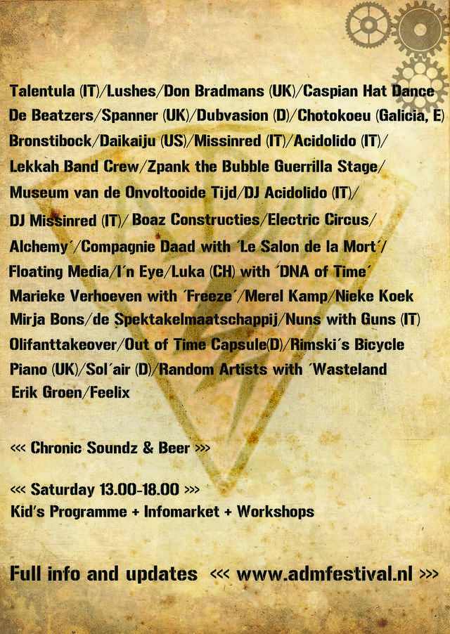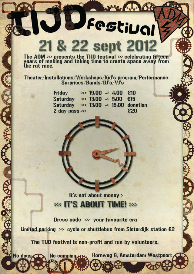 Dit speciale jaar staat het ADM-festival in het teken van TIJD. Het festival verkent de tijd via live muziek en theater uit binnen- en buitenland, installaties, projecties en het museum van de Onvoltooide Tijd. Zaterdag begint met een eigentijdse infomarkt met workshops en actiespelen. Ook is er de hele middag een kinderprogramma. Beide dagen kan tot in de kleine uurtjes worden gefeest tegen de tijdgeest. Programma, achtergrondinfo en updates zijn te vinden op www.admfestival.nl Het TIJD festival is een non-profit festival, door vrijwilligers georganiseerd.