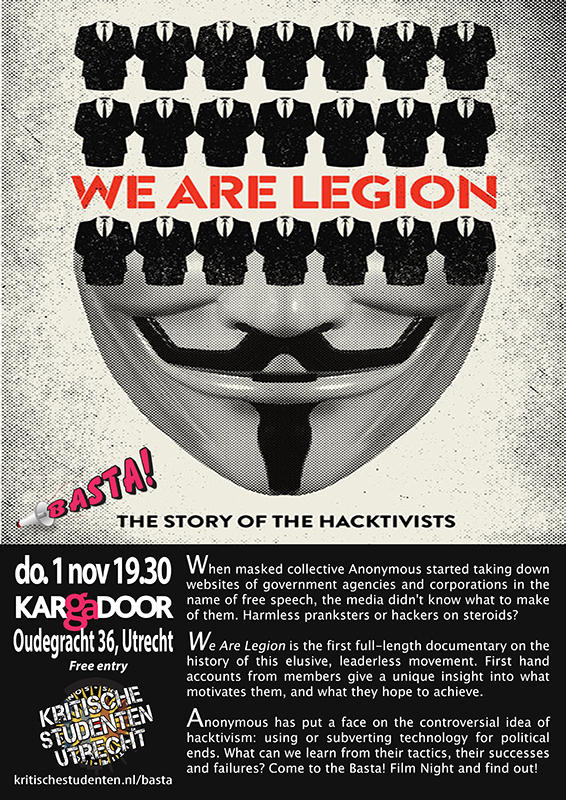 How is Anonymous organized? What can we learn from their tactics, their successes and failures? Is their brand of hacktivism a new addition to the activist's toolkit? Come to the Basta! Film Night on Thursday 8 November, and find out!