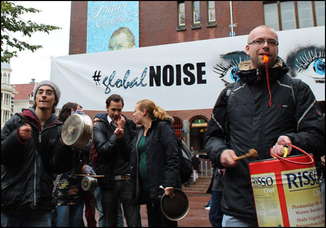 als onderdeel van de wereldwyde global noise aktiedag hielden zaterdagmiddag in amsterdam enkele tientallen mensen een lawaaidemo