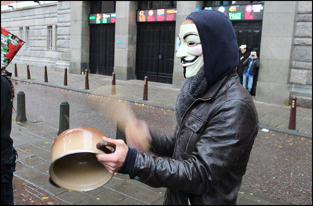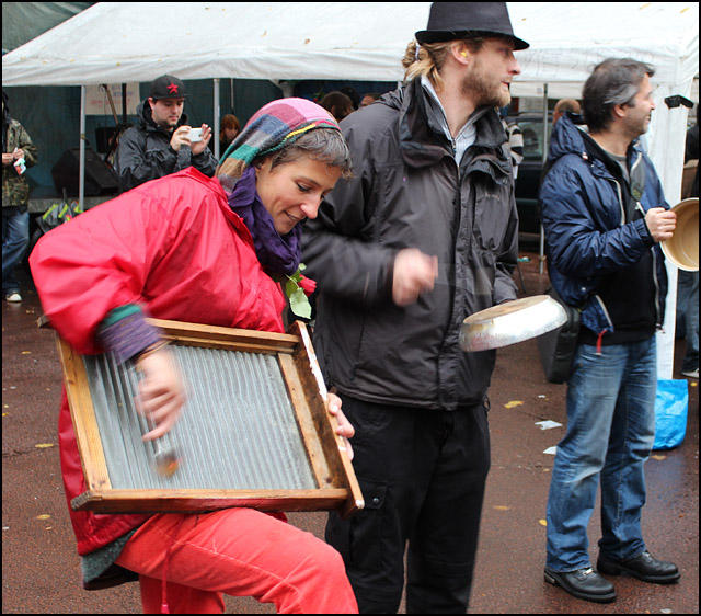 de cacerolazo van potten, pannen, lepels, slaghout en ander geïmproviseerd drummateriaal zorgde voor een kakofonie aan getrommel op het beursplein als aanklacht tegen het mondiale financiële gesjoemel en om te stryden voor een eerlyke verdeling van de rykdommen..