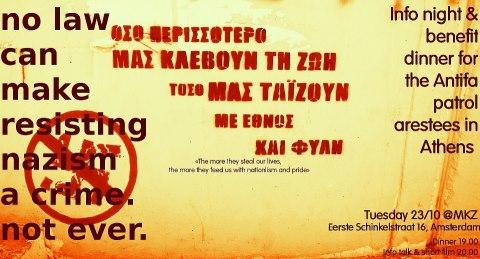 The people that decided to form the antifascist patrols are brave and put their lives on the line, showing immense courage in resisting the neo-Nazis, to protect all of us; yet they are treated as if they are criminals by a system that dispenses selective justice. In solidarity to them and in resistance to fascism, actions are continually taking place in various European cities. Everyone should be informed of what is happening. Police violence and oppression are on the rise, the first victims being those who fight for their rights and support humanitarian ideals, take part in solidarity movements and self-organize for autonomy.