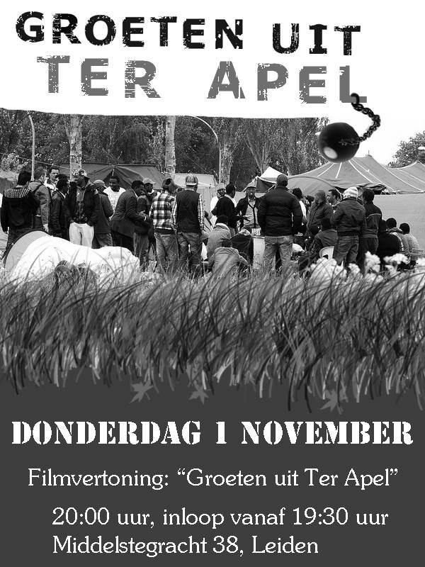 “Groeten uit Ter Apel” laat zien hoe de vluchtelingen zich sterker gaan voelen door samen te strijden voor hetzelfde doel. Willems heeft vluchtelingen en andere betrokkenen opgezocht en geïnterviewd. De vluchtelingen hebben ook zelf beelden geleverd die ze hebben gemaakt met hun mobieltjes en camera’s. Na de vertoning zullen vluchtelingen van het Haagse tentenkamp “Recht op bestaan” vertellen over hun strijd voor verblijfsrecht, voor basisvoorzieningen en voor het recht om überhaupt hun stem te kunnen laten horen. Doorbraak-activisten zullen ingaan op de politiek van migratiebeheersing, het ondersteunen van vluchtelingen en het organiseren van solidariteit.