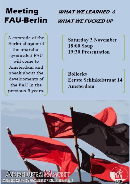 On Saturday 3 November, a comrade of the Berlin chapter of the anarcho-syndicalist FAU will come to Amsterdam and speak about the developments of the FAU in the previous 5 years.