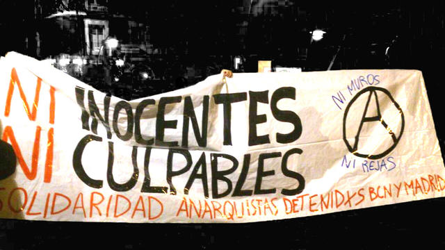 One day before, the instructing judge of the Audiencia Nacional (Madrid) permitted access to the investigative file, and what we know at the moment is what has been circulated through the website of Mossos d’Esquadra in a press communiqué. They are facing charges such as membership in GAC (Coordinated Anarchist Groups), attacks against banks, posting parcel bombs (one to the Archbishop of Pamplona, one to a member of the fascist congregation Legionaries of Christ, and others to Italian companies), while “they are linked”—always according to the police—with the explosive attacks against the Cathedral of Almudena in Madrid (February 7th, 2013) and the Basilica of the Pillar in Zaragoza (October 2nd, 2013), the latter having led to the indictment and pretrial detention of our comrades Mónica and Francisco.