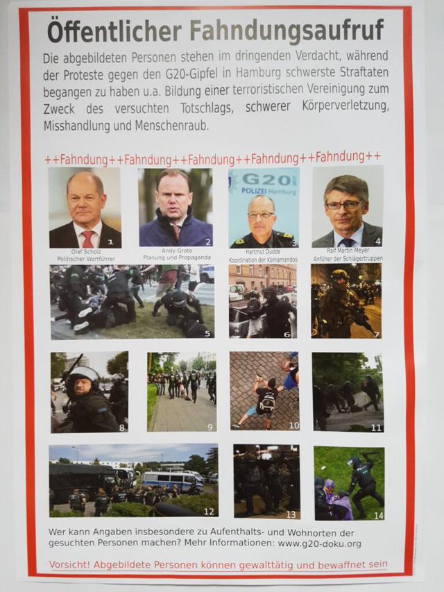 Volgens een gerechtelijk bevel was het officiële voorwendsel voor de invallen in privéwoningen het affiche onder de titel "Terroristen gezocht". Dit toont het voedsel van Scholz, Dudde en Grote, de leiders van de G20-top afgelopen zomer in Hamburg, en hun oproertroepen van de oproerpolitie. bij de Kalabal ging het vooral over het plaatsen van een poster op de deur, waarop een aantal ambtenaren ter bescherming van de staat worden geïllustreerd.