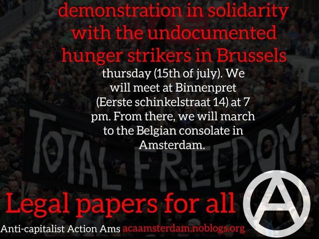 In solidarity with the hunger strikers, we will organize a protest in Amsterdam this thursday (15th of july). We will meet at Binnenpret (Eerste schinkelstraat 14) at 7 pm. From there, we will walk to the Belgian consolate.